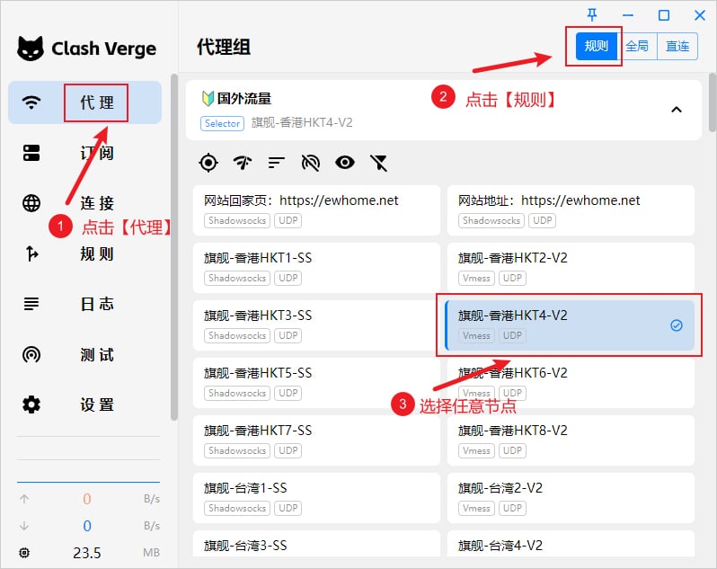 在添加完订阅地址之后,需要选择一个代理节点使用,点击软件主界面左侧的代理选项卡,软件右上角代理规则处默认保持规则即可,代理模式主要有以下三种: