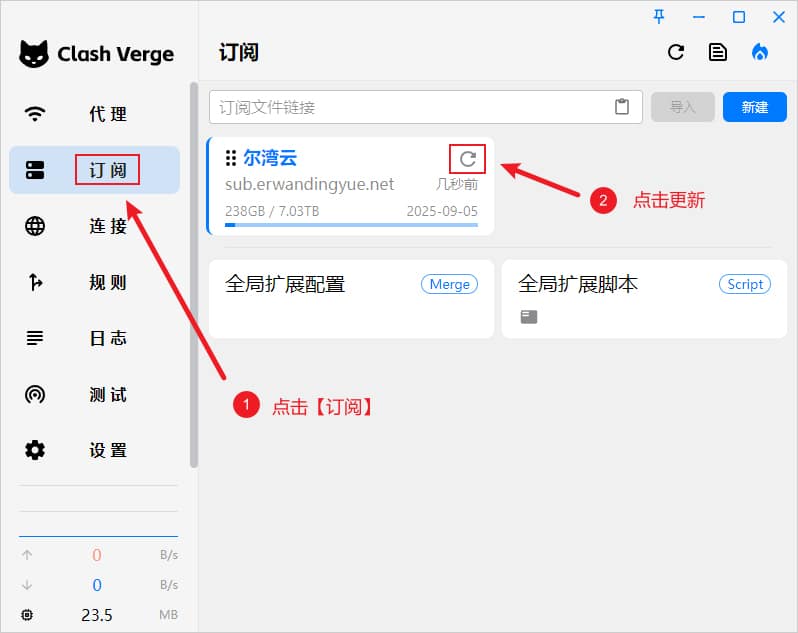点击界面左侧菜单订阅,点击更新图标即可更新配置文件,如下图所示。